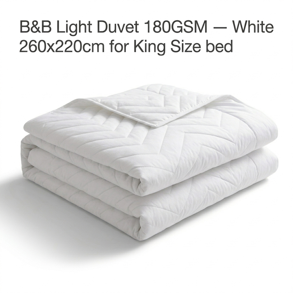 The B&B Light Duvet 180GSM King is priced at KSh 3,995. At microfibre casing with virgin fibre fill in box stitch construction, this is the complete warm-climate hotel duvet specification. Volume pricing available for bulk hotel and lodge orders.